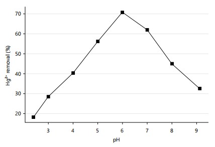Effect of pH: Maximum removal (70.78%) was observed at pH 6.0. Below this pH, proton competition reduces Hg2+ binding; above pH 7.0, Hg(OH)2 formation and deprotonation lower efficiency27.