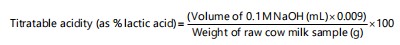 Determination of titratable acidity: Titratable acidity was determined by taking a 10 mL raw whole cow milk sample in a 100 mL conical flask, 5 drops of 1% phenolphthalein indicator solution were added to it and the solution was diluted with 10 mL of distilled water10. The mixture was then titrated with 0.1N NaOH solution until a faint pink color appeared. The volume of NaOH consumed during the titration was recorded and used to calculate the Titratable acidity (%). Titratable acidity of the raw whole cow milk samples was expressed as percent lactic acid9 as follows: