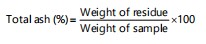 Determination of total ash: Determination of ash content (mineral content) in a raw whole cow milk sample was done using the Gravimetric Method11. In this method, the milk samples were dried in an oven and the dried milk samples were weighed and ignited in a muffle furnace at a temperature of 550°C for 3:00 hrs, which made the dried milk samples burn to ashes. The ash was cooled in desiccators and then their weight was determined. The percentage ash content was calculated as follows: