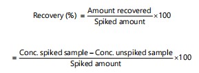 Recovery test: A spiking experiment was done to check the accuracy of the digestion procedure and the atomic absorption spectrophotometer as there were no certified milk standards. In this experiment, one sample was selected (5.0 mL of raw whole cow milk sample), spiked with 50 μL of 1000 mg/L of Ca, Mg, Cu and Mn standard solutions at once and digested following the same digestion procedure used for unspiked raw cow’s milk samples. The spiked samples were digested in triplicate and analyzed for the respective metals. The %recovery for each metal was calculated using the following formula13: